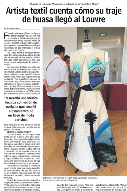 Soy artista visual textil y docente chilena. Investigo y trabajo la técnica artesanal de vellón agujado sobre tela, dando un nuevo soporte expositivo y materialidad a mi obra. He realizado exposiciones y clases de mi investigación a nivel internacional, colaborando con instituciones culturales en Francia, Canadá y Ecuador."