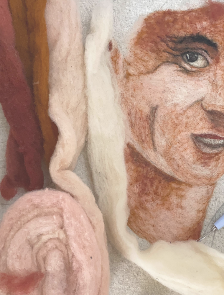 El fieltro cardado que utilizo, gracias a su alto índice de grasa, permite que la aguja especial entrelace las fibras de manera más densa. Es necesario introducir la aguja repetidas veces para que el material se adhiera de forma homogénea sobre la tela.Desde esa base, trabajo el color capa por capa, representando luces, sombras, líneas y todos los detalles que imagino.