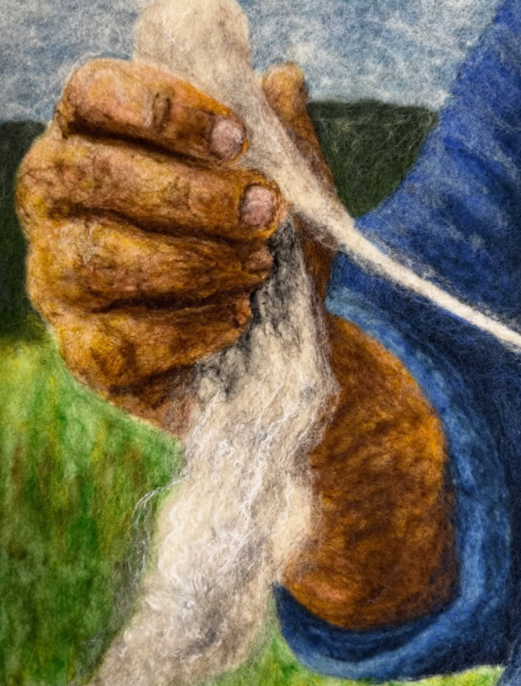 El material con el cual trabajo mis obras proviene del pelo de oveja chilena, específicamente de la zona centro-sur del país. Esta fibra posee un alto índice de grasa, lo que la hace única y perfecta para esta técnica artesanal.
